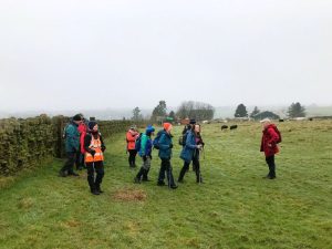 On a very misty morning fourteen walkers set out from Greenmount to complete the first section of the West Pennine Way (WPW). We followed our distinctive orange way markers into Hollymount and down to Brook Bottoms. At this point the route should turn left and head up the steep valley to Turton Road, but when we checked this section, we decided that the footpath up to the main road was too dangerous. Instead, we carried straight on in the direction of Hawkshaw and once over the ladder stile we turned left and headed up to Affetside. After stopping for our morning break, we joined the WPW markers and followed them down to Bradshaw Road.