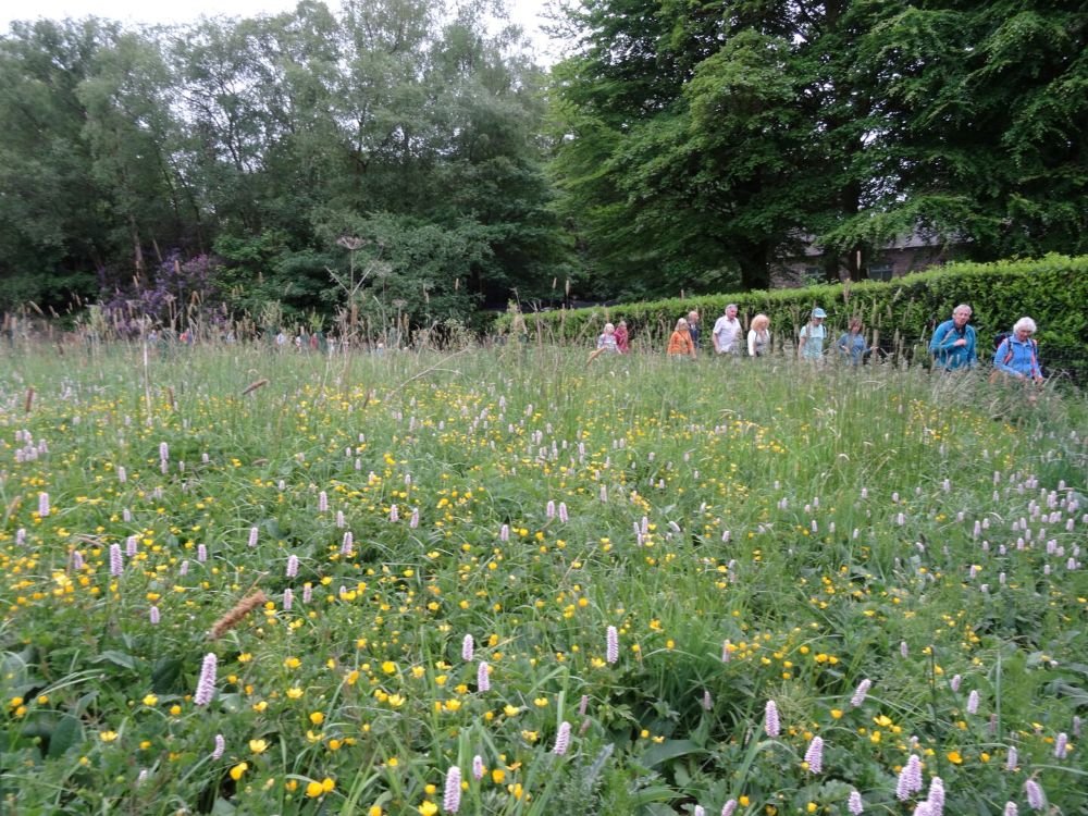 Once through the woods we crossed Bradshaw Road and joined a track leading to Bradshaw Cricket Club, but just before the club we turned right onto a footpath that followed Bradshaw Brook along the Kingfisher Trail. Along route we passed several historic properties, the first being Rigby Cottages that dates back to the 1600s then just before the path turned left, we passed Rigby Mission, which originally was a bleach works and has now been converted into a private house. The last of these buildings or what is left of them is Bradshaw Hall and Bradshaw Bleach works. Unfortunately, we did not see any kingfishes flying over the brook, but we did pass through some glorious fields, full of wildflowers. At the end of the trail, we arrived at the steep climb back up to the car park having covered 4.5 enlightening miles.